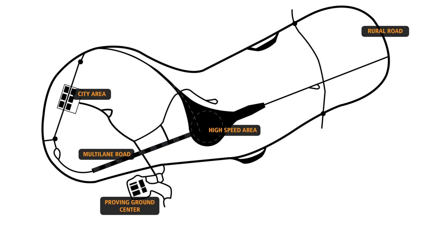 The testing area, which covers some 2000,000 square meters, is reminiscent of a gigantic movie studio containing nearly six kilometers of rural road with intersections, street lights and bus stops, as well as a city environment where vehicles can be tested in authentic scenarios involving other vehicles in heavy traffic, cyclists and pedestrians, a multilane motorway and an area for high-speed testing.