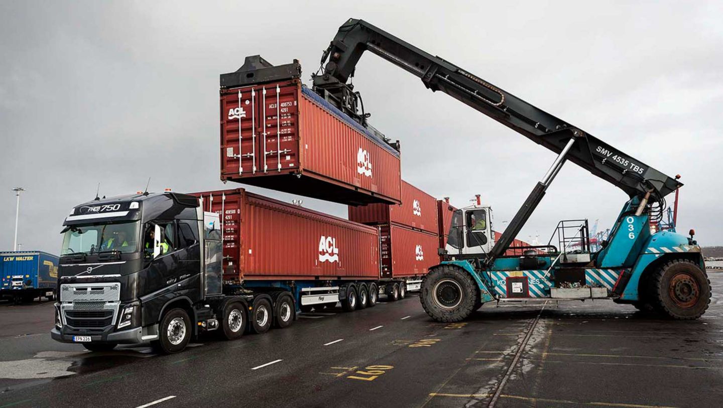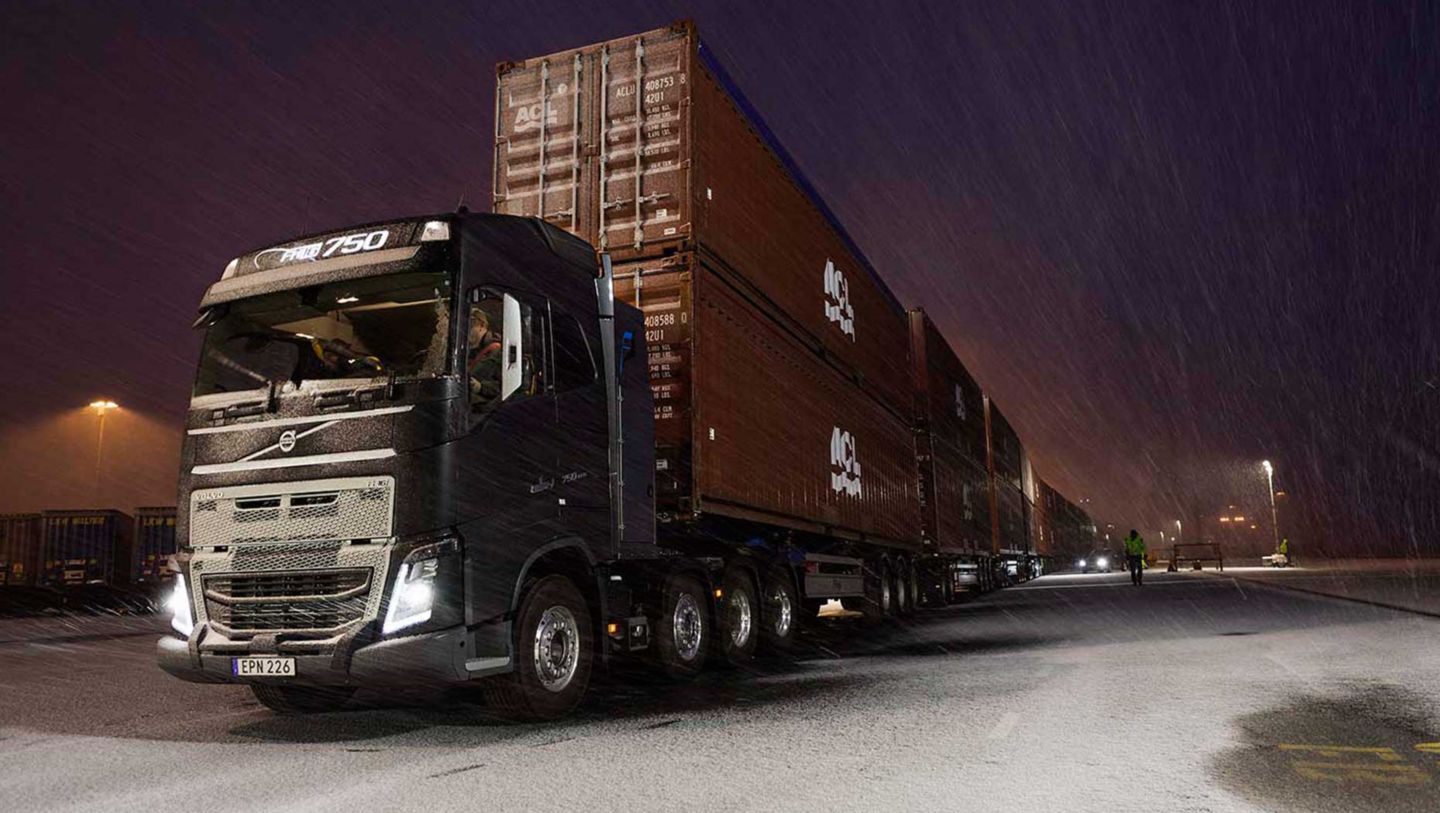 Dans le port de Göteborg, en Suède, 40 conteneurs remplis de pièces détachées de marque Volvo reposent sur 20 remorques et constituent un train routier de 300 mètres de long. L'ensemble, avec le véhicule, pèse 750 tonnes.